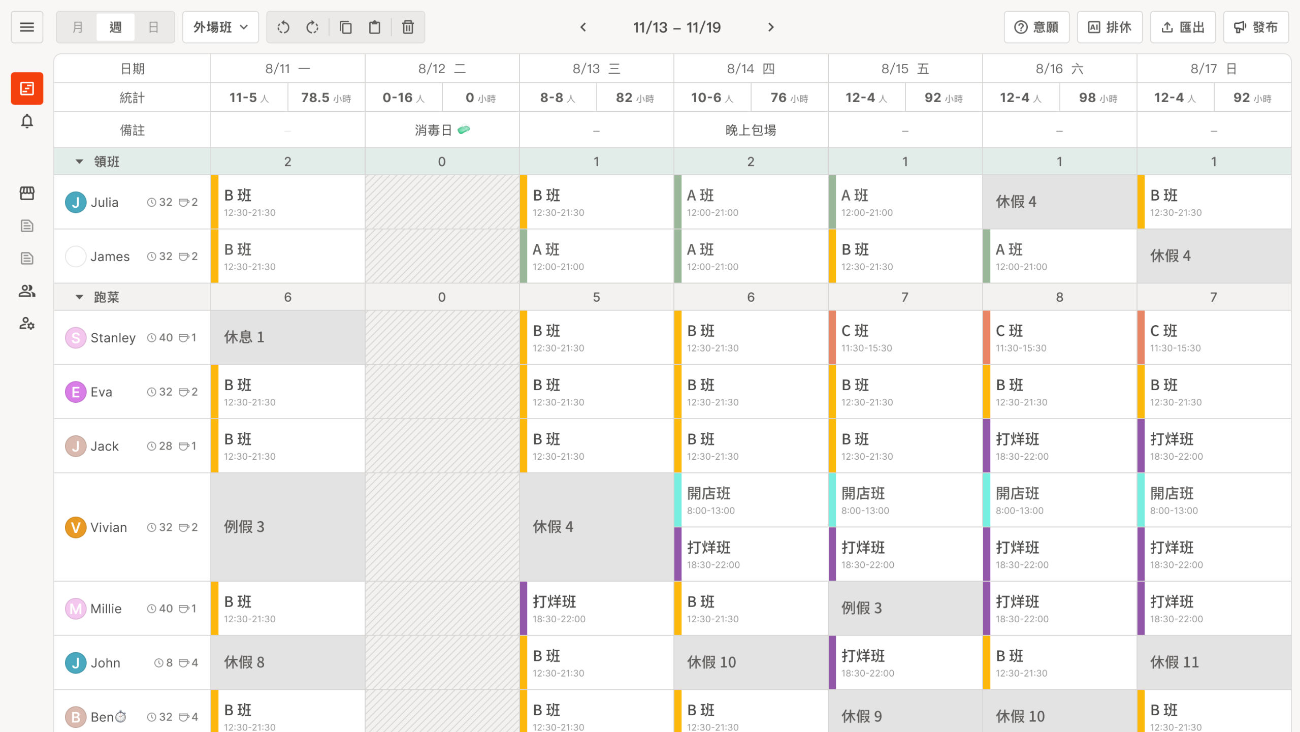依據餐廳經營的需求,區分外場/內場班表、早場/晚場人力等,輕鬆管理員工群組