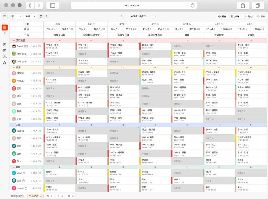 FREONE 適合各種餐飲&手搖品牌,無論是單一門店還是連鎖餐廳,都能輕鬆管理排班需求&調度人力